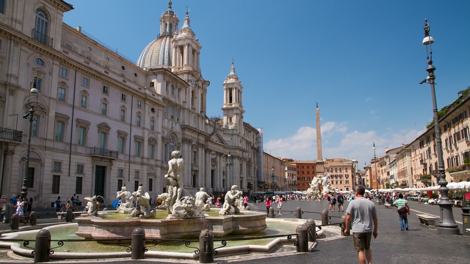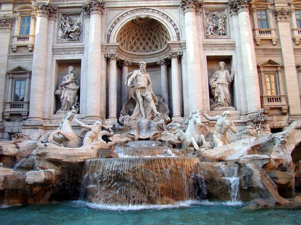 A Fontana di Trevi (Fonte dos Trevos) deve seu nome ao fato de no passado ter sido o cruzamento de três estradas e também o ponto final do Aqueduto de Vergine. Seu projeto foi feito por Nicola Salvi que morreu durante sua execução e foi terminado por Giuseppe Pannini. A estátua central é a de Neptuno que tem ao seu lado dois Tritões, um dominando cavalo-marinho rebelde e dominando um cavalo-marinho mais manso, ambos representando o contraste das marés. A fonte está cheia de moedas pois diz a lenda que quem joga moedas na água da fonte tem seus desejos atendidos.
